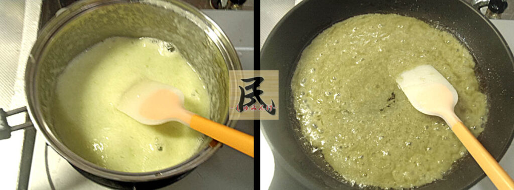 ②ペーストを鍋に移し弱火で余分な水分を飛ばす。出来上がったら火を止め、パルメザンチーズを加えて混ぜ込み、必要になるまで待機。