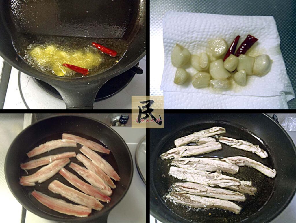 ①フライパンにオリーブオイルをしき、ニンニク、鷹の爪をを投じ、弱火で香りをオリーブオイルにうつす。