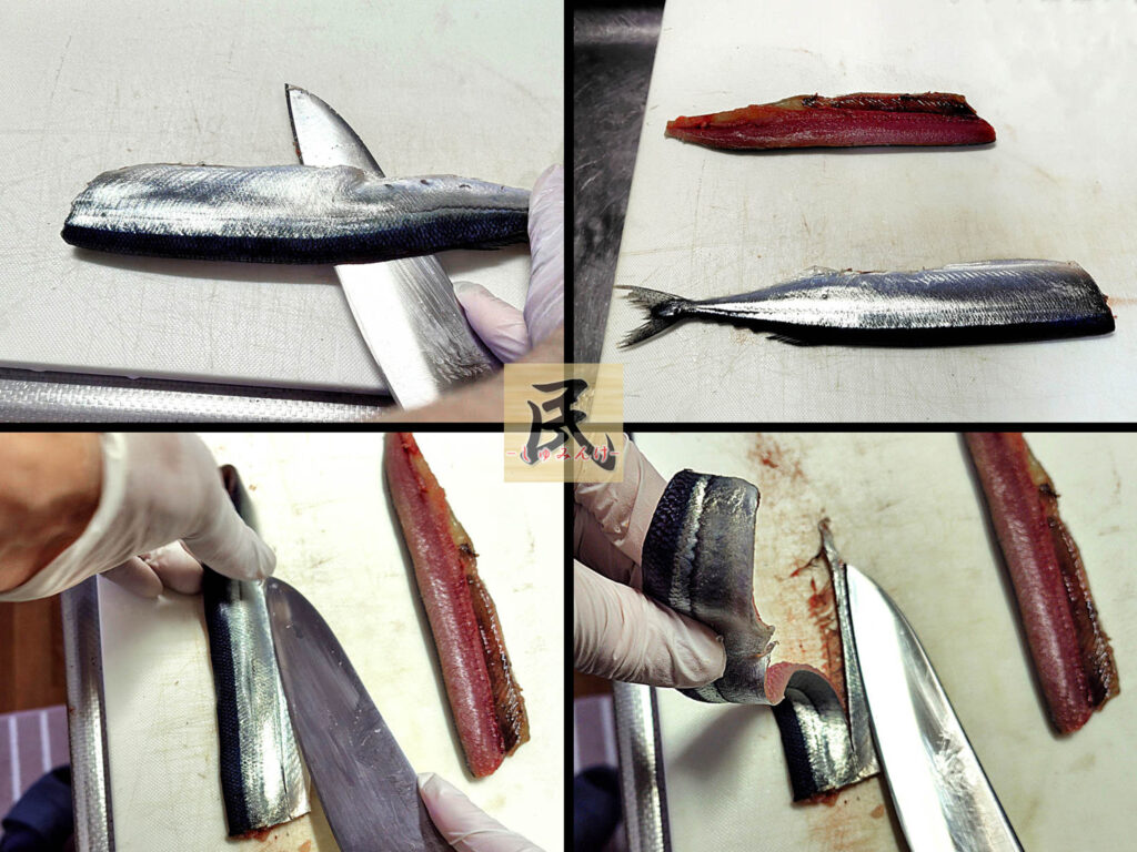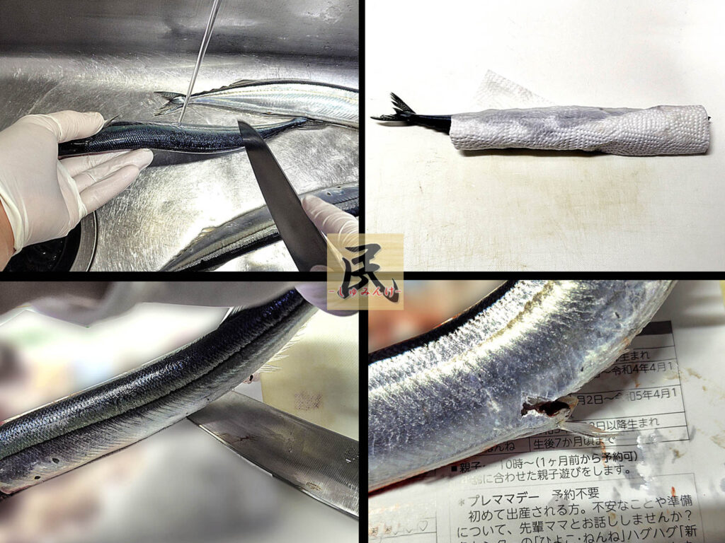 ①サンマを軽く水洗いし、一見水揚げの際にすべて鱗が落ちてしまっているようにみえるが、包丁の切っ先で鱗を取る。特に背中側に残っている事が多い。