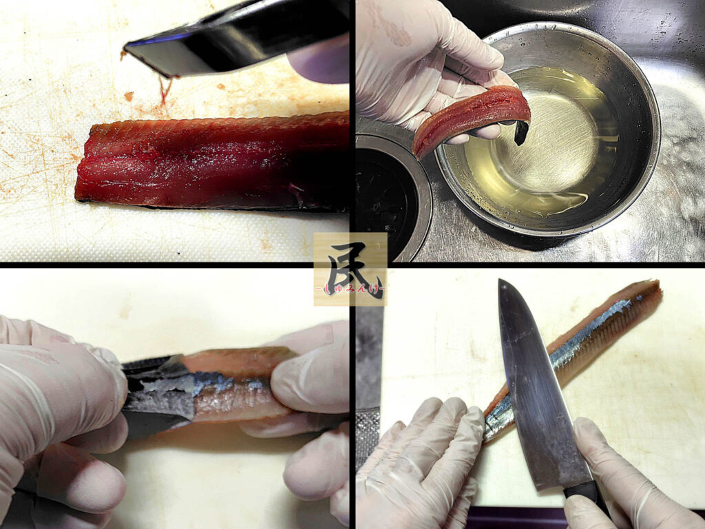 ⑭血合い骨を骨抜きで抜く時は、通常頭の方向に抜くのを尾の向き側で抜くと身が裂けつつも、次の骨が現われ連続作業で血合い骨を取り除くことができる。