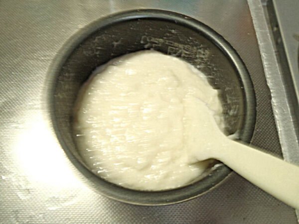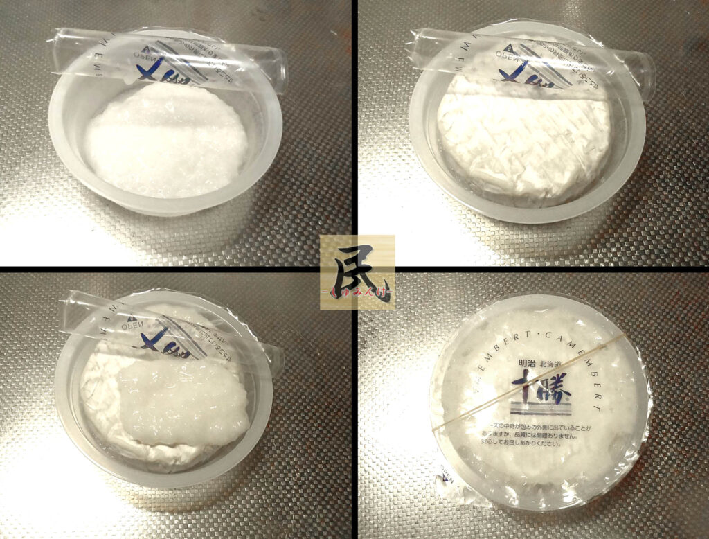 ①包装の蓋を8割ほど開けて、カマンベールチーズを包装から取り出し、元の容器に収めて隙間に塩麴を詰める