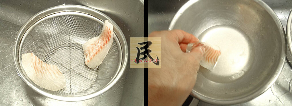 ①刺身用鯛の身の柵を二等分にし、砂糖約6gをまぶし、次に塩約6gをまぶしてザルに貼りつけて余分な水抜きを行う。