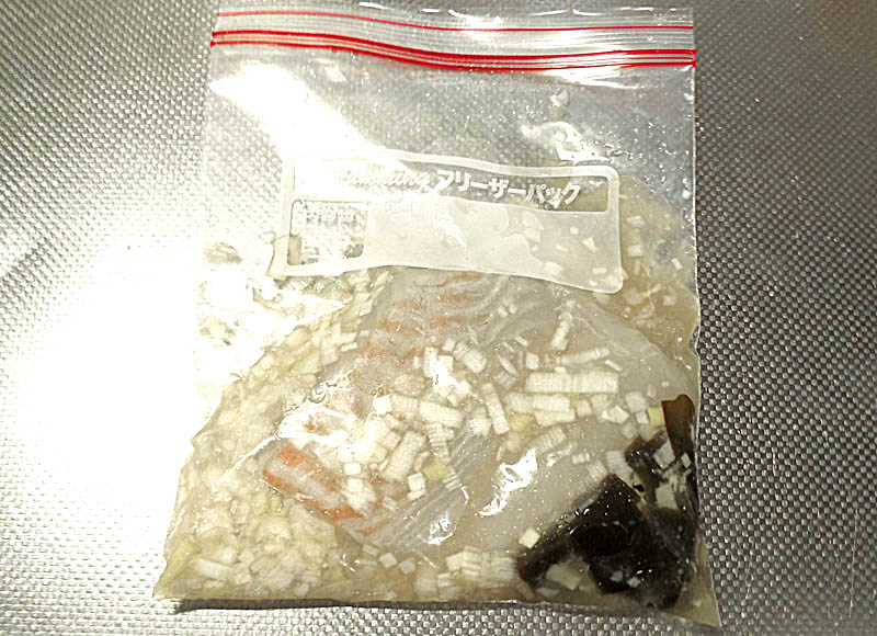 ①ジップ袋の中に漬けダレと鯛の身を入れ、空気を追い出してジップする。