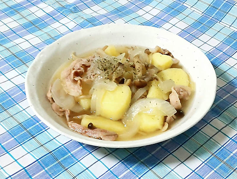 ⑤-2豚バラ肉からにじみ出た油を焼き脂と利用してフライパンに玉ねぎを炒め、透明感が出てきたところジャガイモを加え、全体に油が回るようにかき混ぜ、蓋をして弱火で蒸す。