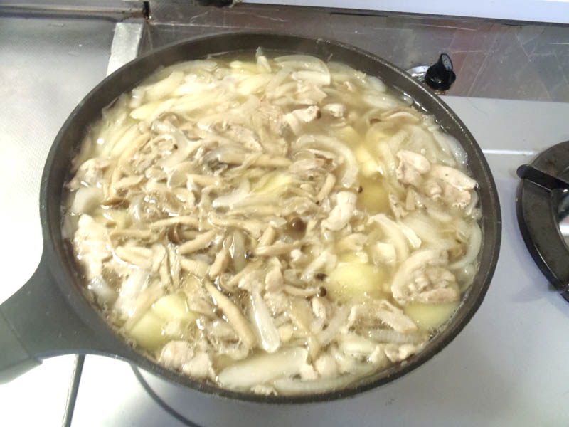 ⑥野菜全体に火が通ったところで、全体が浸る程度に水と取り分けた豚バラ肉と塩麴キノコ100gを加え、味見をして調整し、さらに蓋をして10分程煮こんで完成。