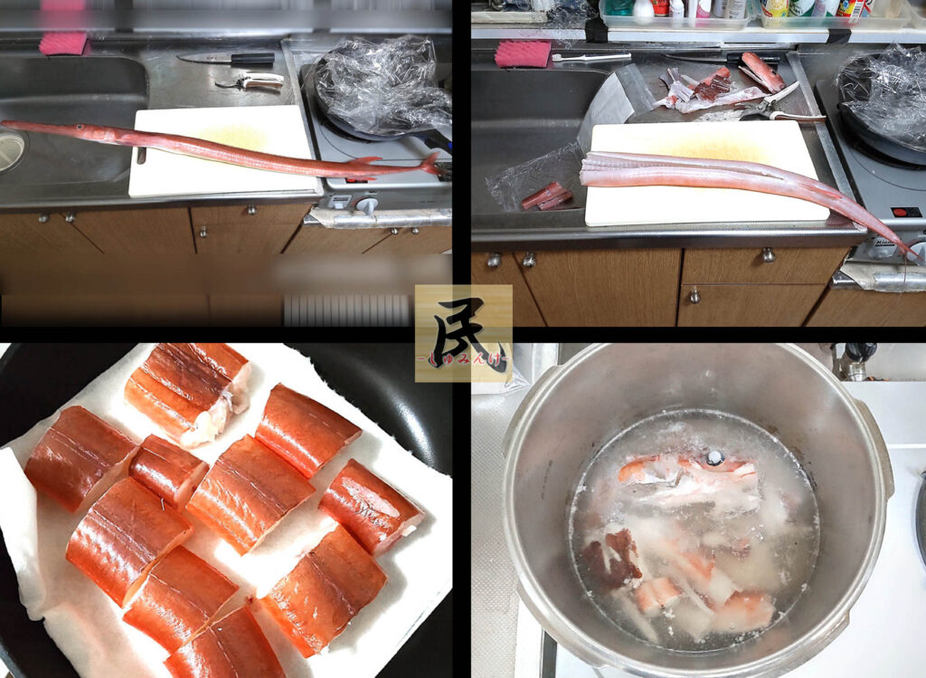一般家庭で多く使われる横幅35㎝クラスのまな板ならそのサイズに合わせて魚を捌くのが無難だと思いますが、頭を落として内蔵を取り出した「ドレス」状態なら2kgクラスの魚も行けると思います。まずはシンクで水洗いして鱗を落とし水気をふき取っていらぬものを切断すれば、サワラだろうが、アカヤガラだろうが、タチウオだろうがまな板のサイズに収まればいけますが、まあ、私が勧めるのは35㎝クラスのお魚までが無難だと思います。