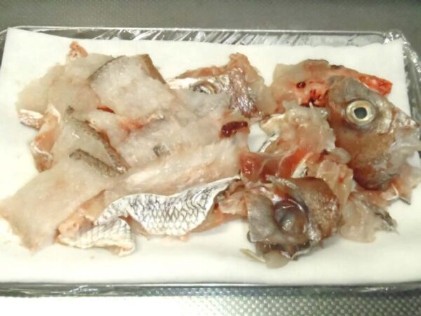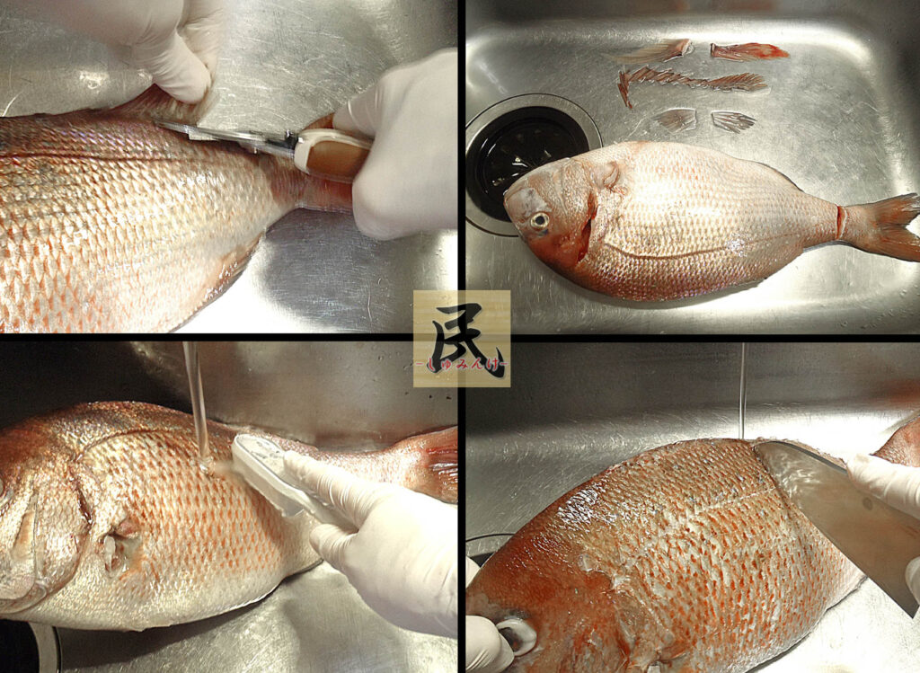 ①鯛のヒレをキッチンバサミで切断し、軽く水洗いし、ウロコカキで鱗を取り、包丁でヒレのあった際など鱗取りでとり切れなかった所を掻いて水洗いして飛び散った鱗を洗い流し、キッチンペーパーで水気をふき取る。