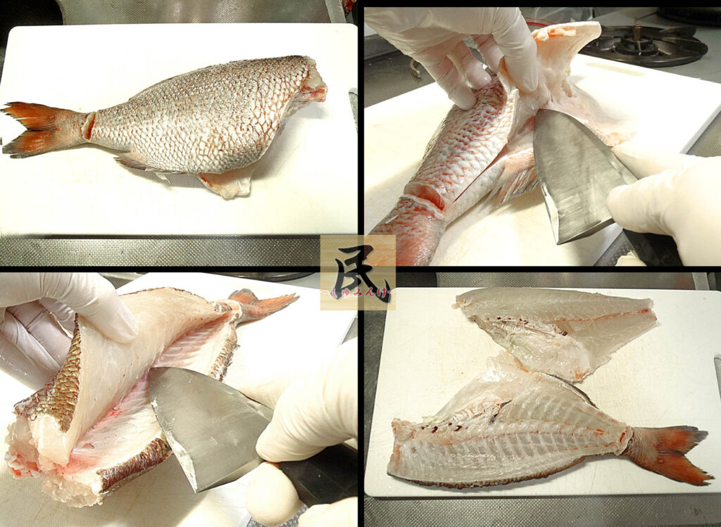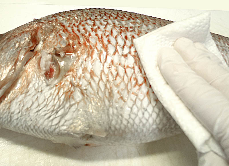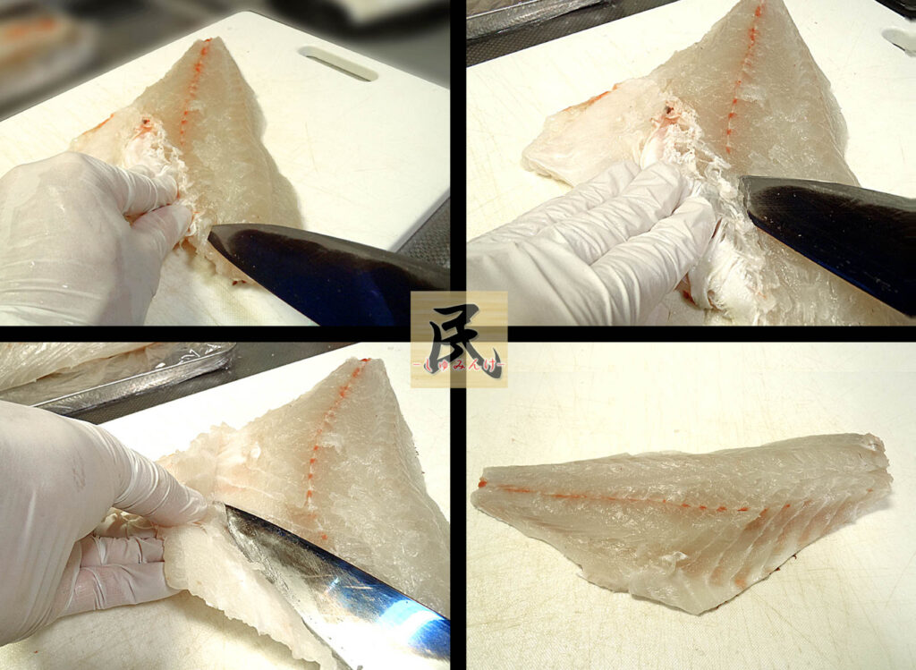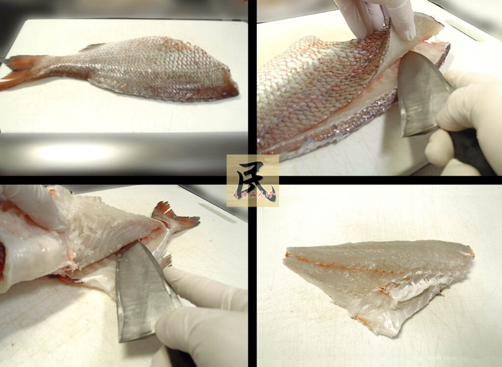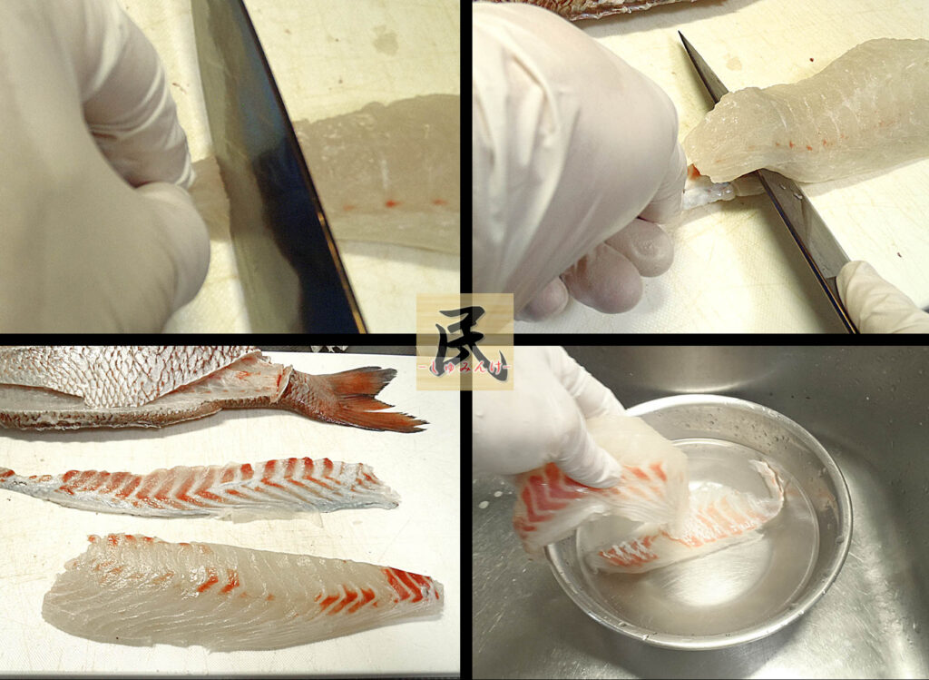⑱柵どりを終えたら、3%冷食塩水で洗い、水気をキッチンペーパーでよくふき取る。鯛の上身の完成です。
