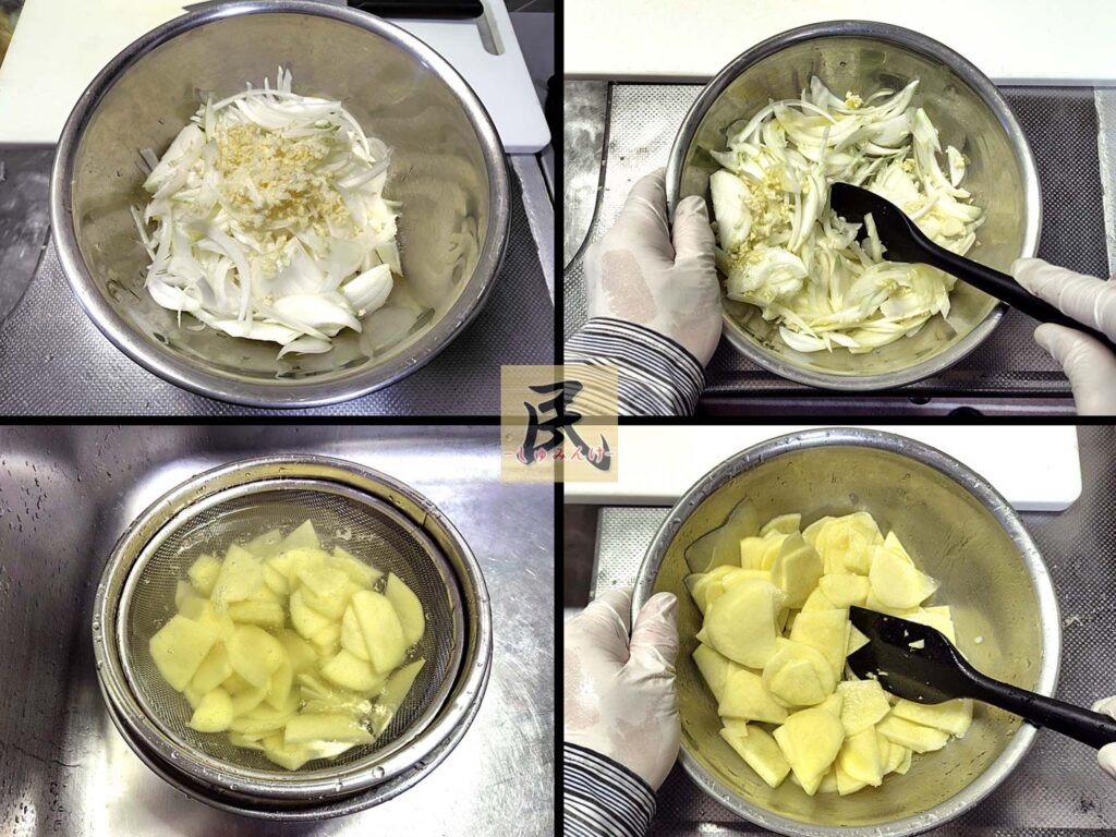 ③薄くスライスしたジャガイモを水に晒してデンプンを落とし、水気をよく切って、具材の重さに対して約1%の塩を入れて混ぜ合わせ、続いてオリーブオイルを具材の表面にまとわせる程度入れて混ぜ合わせる。
