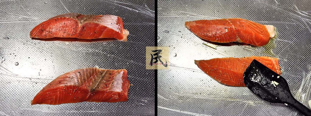 ④サケに皮が付いていたらそぎ落とし、にじみ出ている水気をキッチンペーパーでふき取ってから、表面に軽く塩胡椒を振りなじませ、オリーブオイルを薄く塗る。