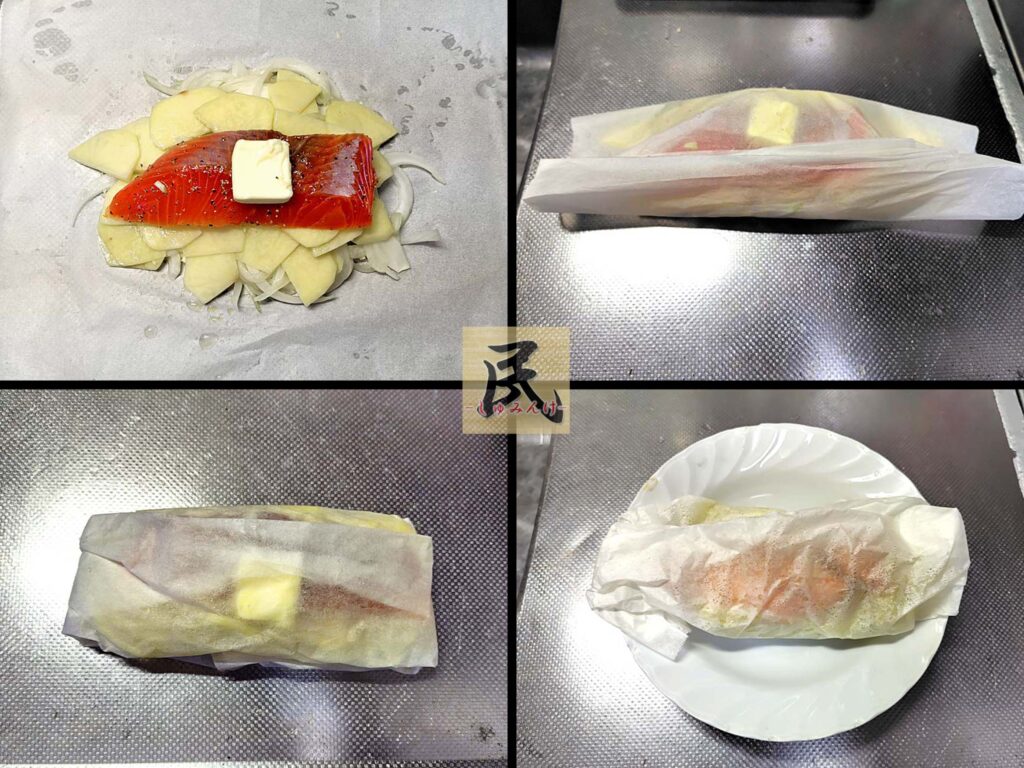 ①クッキングシートの上に玉ねぎスライスを敷き、ジャガイモを乗せ、サケを乗せ、バターをそれぞれに10gずつ乗せる。
