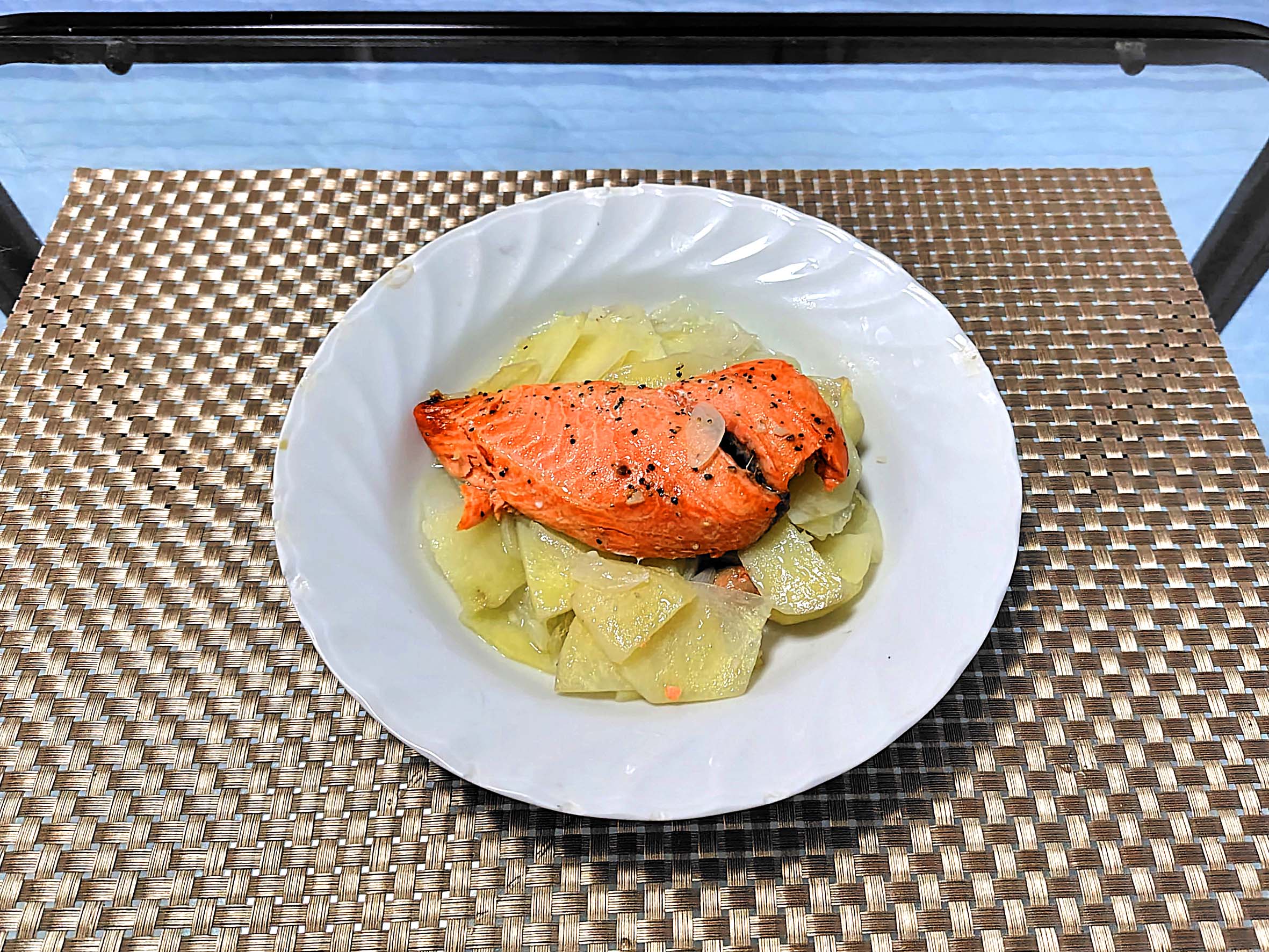 新玉から出る濃厚美味いスープが素晴らしく、塩だけで味が決まる。サケはむしろ脇役で他の食材でも成立する美味しさでした。火を使わないホイル焼きの代用と考えても手間がかからない料理としてかなり良い。