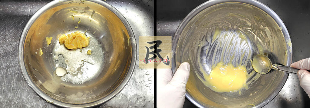 ①ボールに白みそ大さじ2、酢大さじ1、砂糖小さじ1を良く練り合わせる。