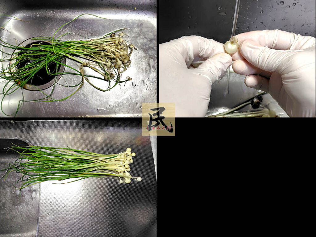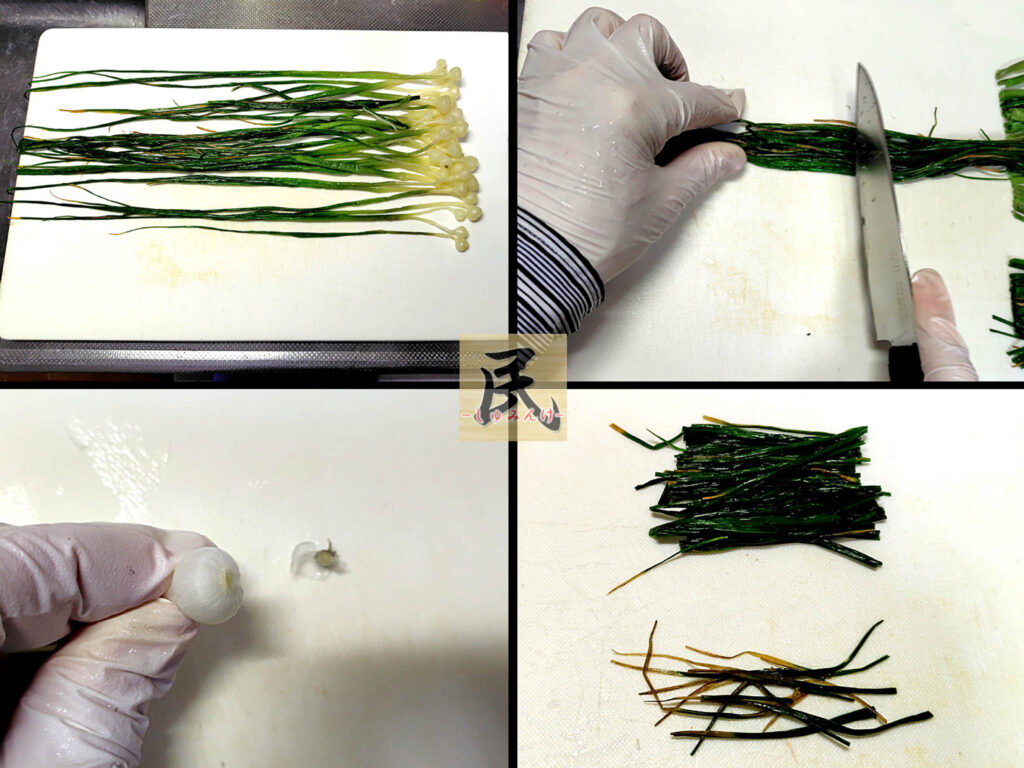 ①ノビルを水道水で洗い、根と、球根を覆う薄皮を取り除く。