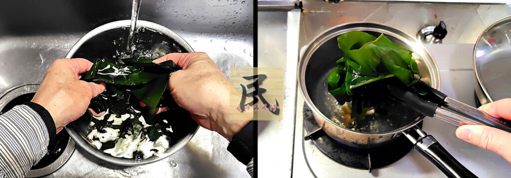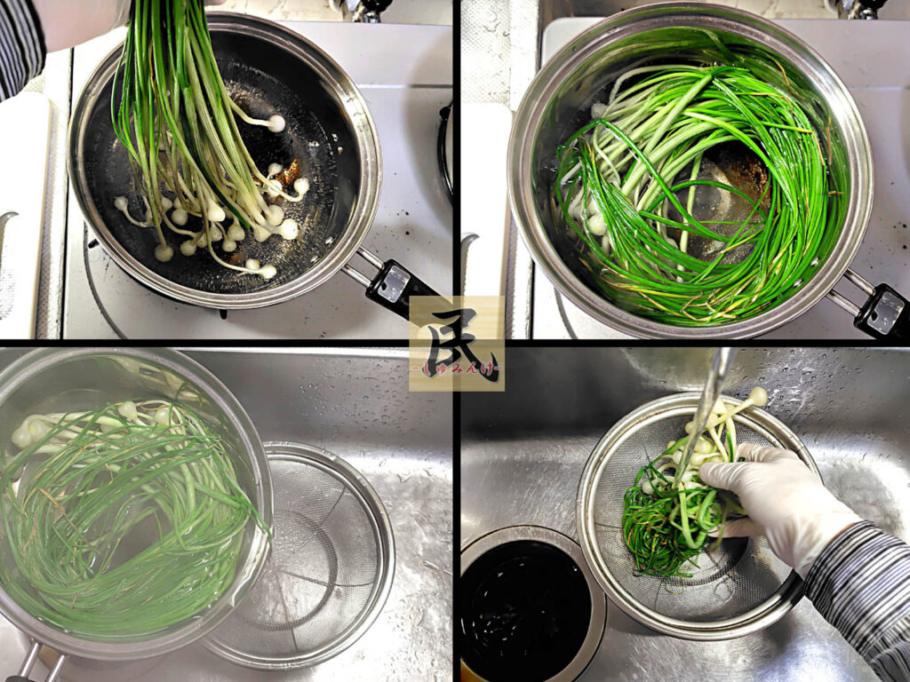 ①水道水で洗い、水けをきり、沸かした湯の中に根を先に入れ30秒ほど茹で、全体を湯に投じる。