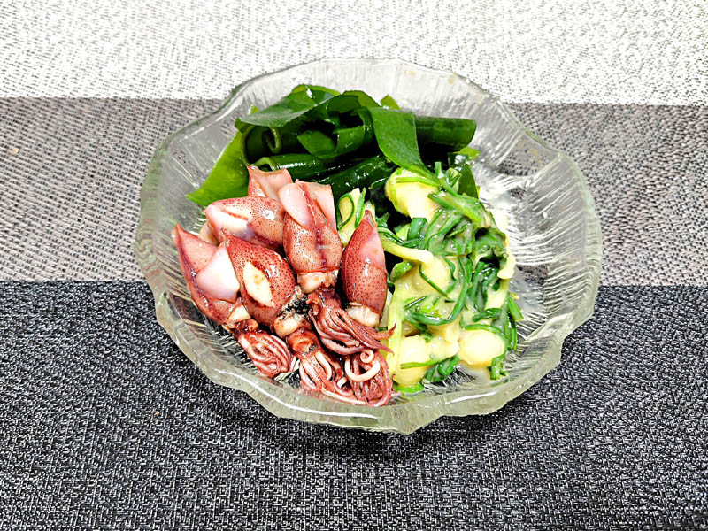 ①器にホタルイカと生わかめを盛り付け、ノビルの酢味噌和えを添えて完成。