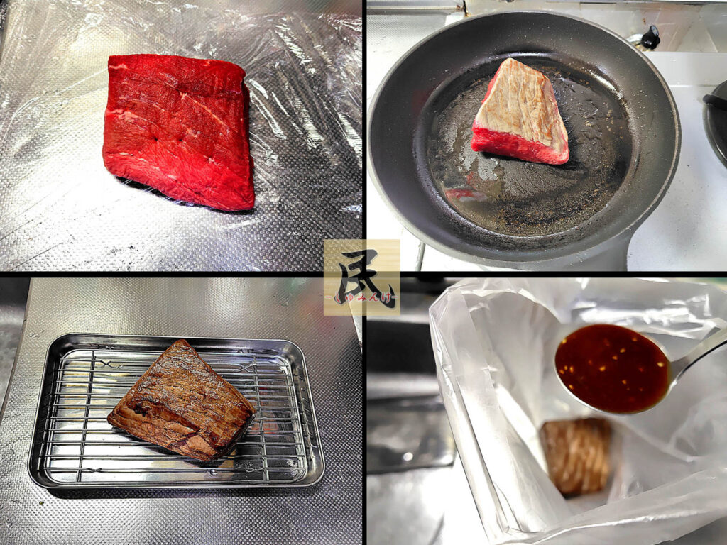 ①フライパンに焼き油を入れ強火で加熱、十分に温まったら牛モモ肉を入れ焦げ付かない様にフライパンを揺らしながら焼き色が付くまで一つの面を1分から1分30秒焼き上げ、途中肉の焼け具合から中火にする。(調理後はフライパンを洗わない事)