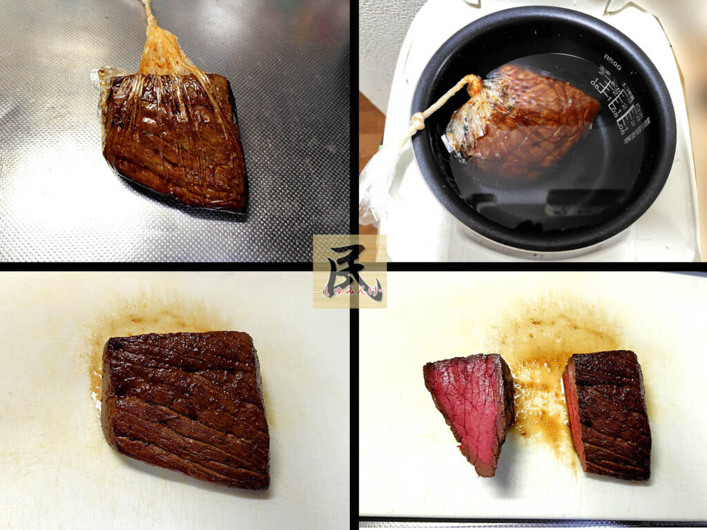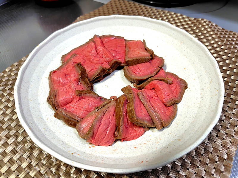 オージービーフの肩モモブロック肉を調理しましたが、薄切りにしないと咀嚼困難な肉ですね。(和牛モモブロック肉(100g/600円)では柔らかくて美味しかったです)薄切りにしてソースと合わせて楽しめればいいかもとは思いました。今回は表面を焼かずに低温調理されたお肉を頂きましたが、炊飯器では温度コントロールもできませんので火が通しすぎたかなという感じは有りました。参考までに牛肉の低温調理は中心部まで55度、45分というレシピからしても今回の60度を超える温度で1時間維持はちょっとお肉の美味しさを逃した温度だったと思います。でも、あまり攻めすぎると食中毒が怖いので、これはこれで良いのかな・・・