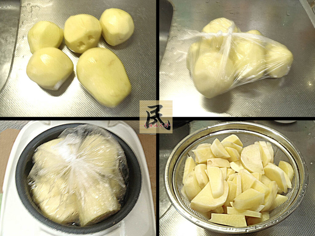 ①ジャガイモの皮を剥き、水洗いした後、耐熱袋に入れ、熱湯を張った炊飯器窯に入れ、再加熱モードを1回以上やり、(目安として、水からだと2回、沸騰したお湯なら1回程度)温度を65度から70度付近まで上げて保温状態で待つこと60分。