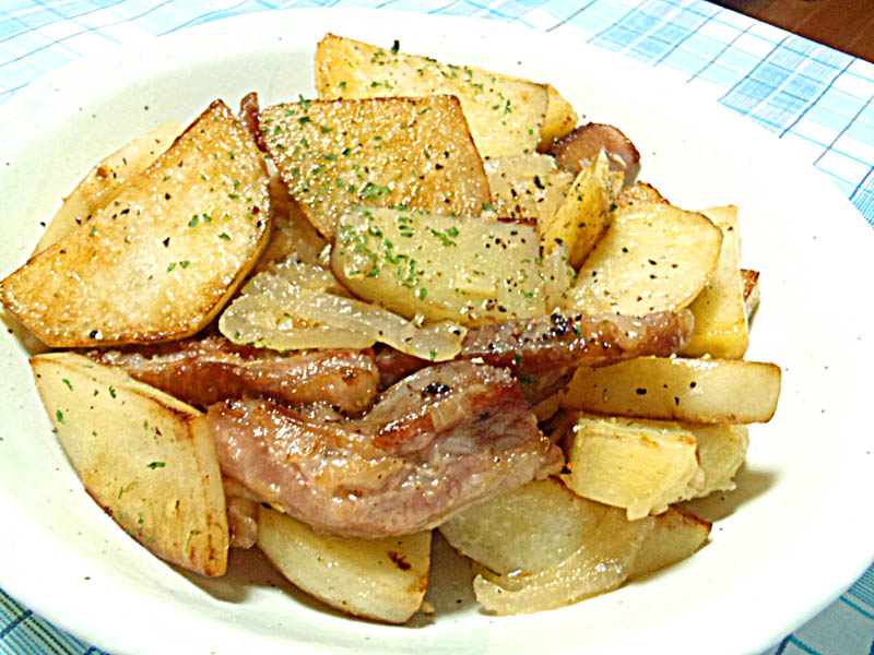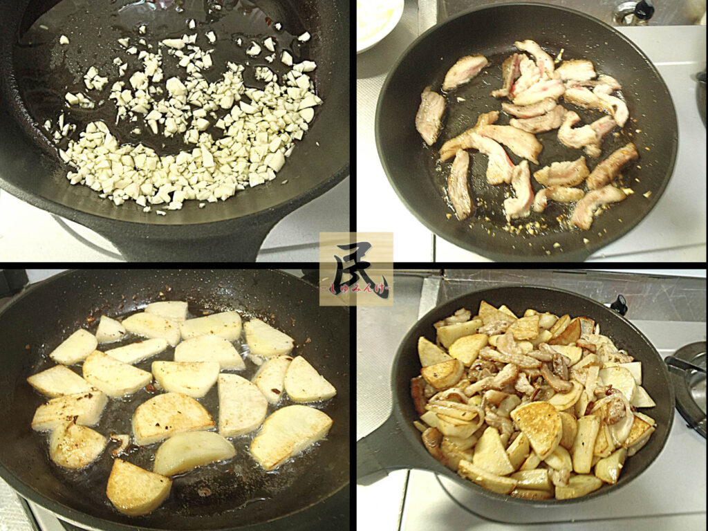 ⑥ジャガイモを入れて油とよく馴染ませるように炒めて焼き色が付いたところで、別容器に移した玉ねぎ、ベーコンを加え、塩、胡椒で味を整える。