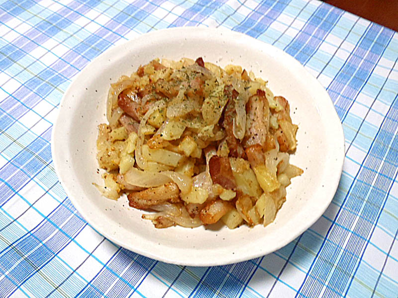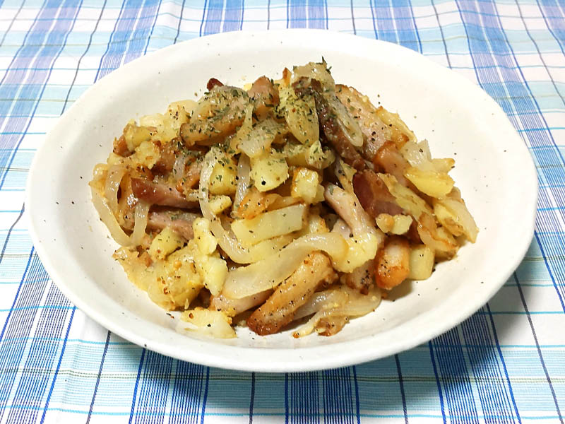 ⑤ジャガイモを入れて油とよく馴染ませるように炒めて焼き色が付いたところで、別容器に移した玉ねぎ、ベーコンを加え、塩、胡椒、みりん、マスタードで味を整える。