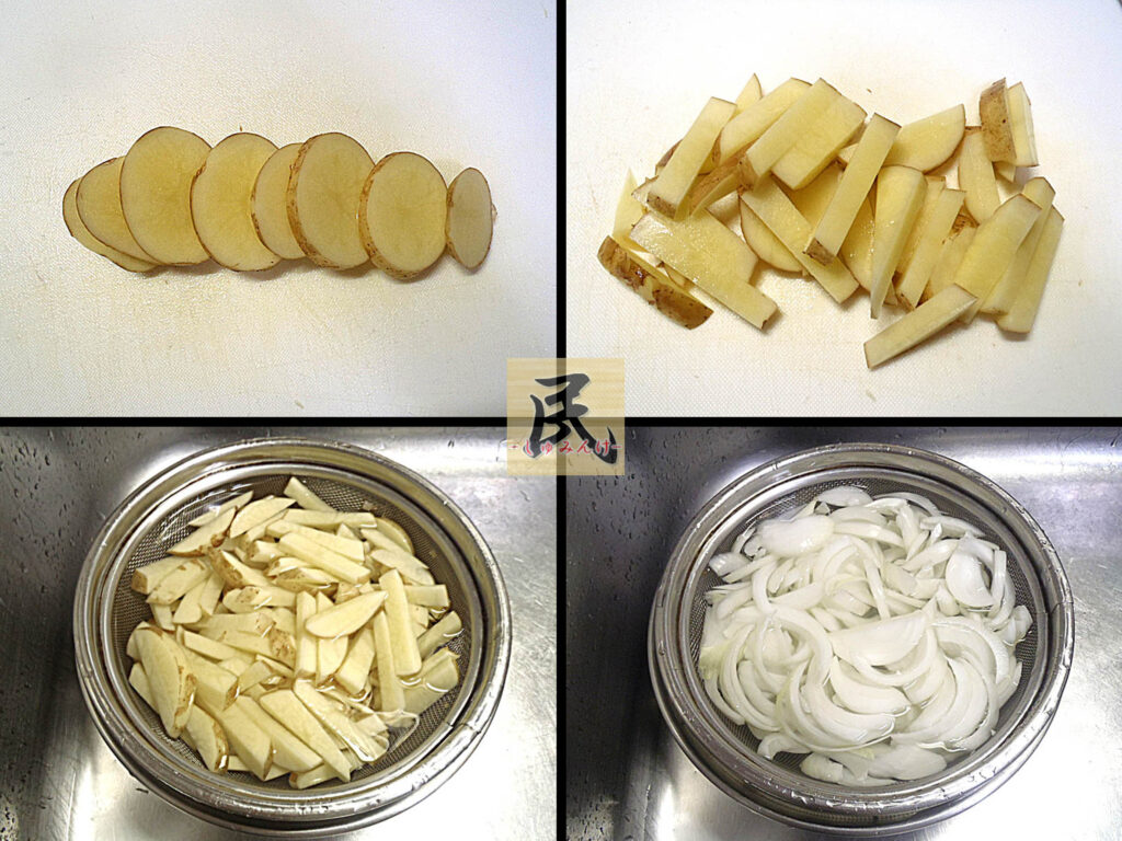 ①新ジャガイモをよく水洗いした後、皮付きのまま細切りにしてボールにザルをセットしたところに入れて15分程、水を入れ余分なでんぷんを落とす。