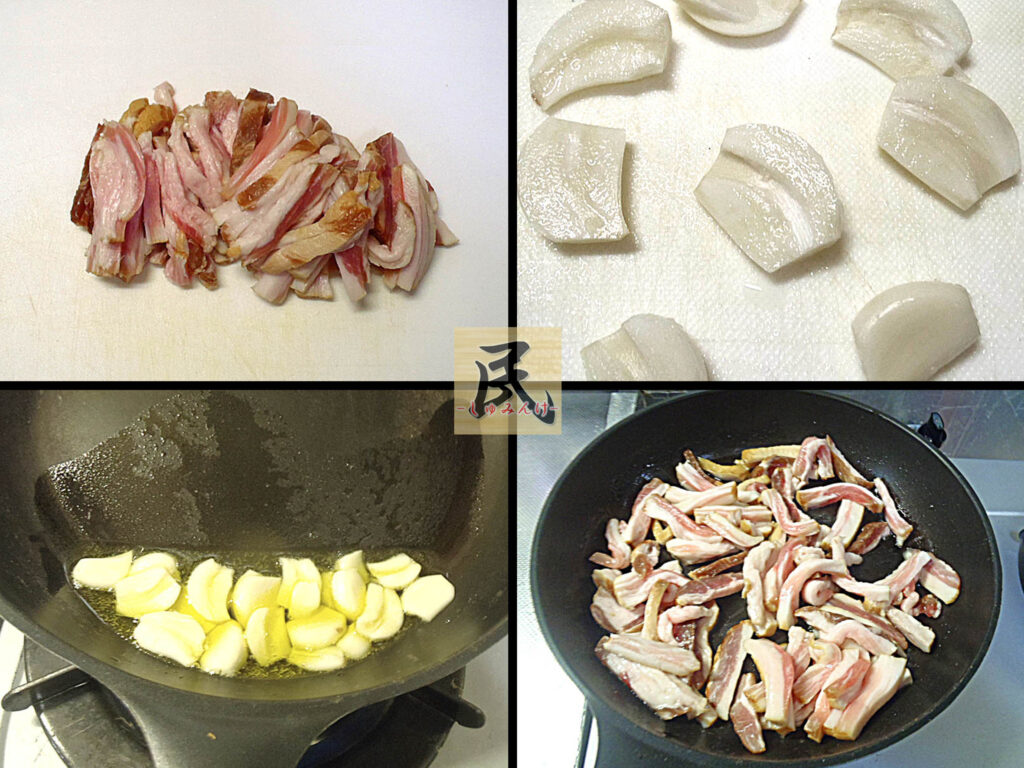 ①ベーコンを1㎝厚さに切り、更に1㎝幅に切る。
