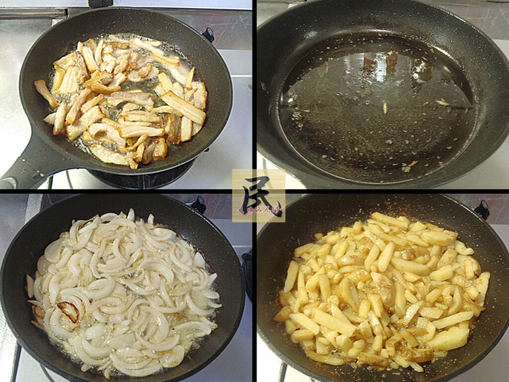 ④玉ねぎを投入し中火で炒め、焼き色が付いたところで別容器に移す。