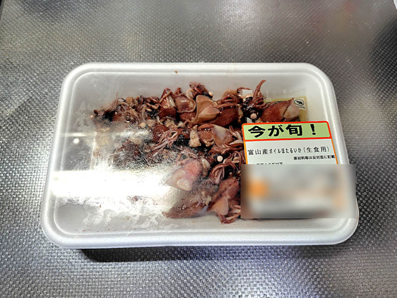 なお、今回手に入れたホタルイカはお店側の事情で仕入れの際に、数を確保できなかったのか、値段が高くて客層にあった価格で売れない事情?でスチロールトレーの底に貼られたシールには三陸沖産と明記されているので、多分冷凍ホタルイカです。胴体と足が分かれていたり、胴体部分妙なクセがついているのはそういう事情。だからと言ってこの季節仕入れないと、あって当り前感覚で訪れたお客さんを裏切る形になるので、お店側も苦渋?の決断だったのではと思います。(でも、パッケージ表面は、富山県産「今が旬!」なんて謳い文句のシールを貼るのはどうかと思うけど)そんな、ホタルイカですから水揚げ後すぐに窯上げし、陸送されてきた前回の物に比べて味は劣ります。が、だからこそ、そういうホタルイカだからこそ効果が出れば喜びも倍増です。