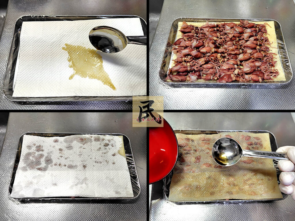 ③ホタルイカを並べてキッチンペーパーで覆い、残りの酒・醤油を全体にまぶしかける。