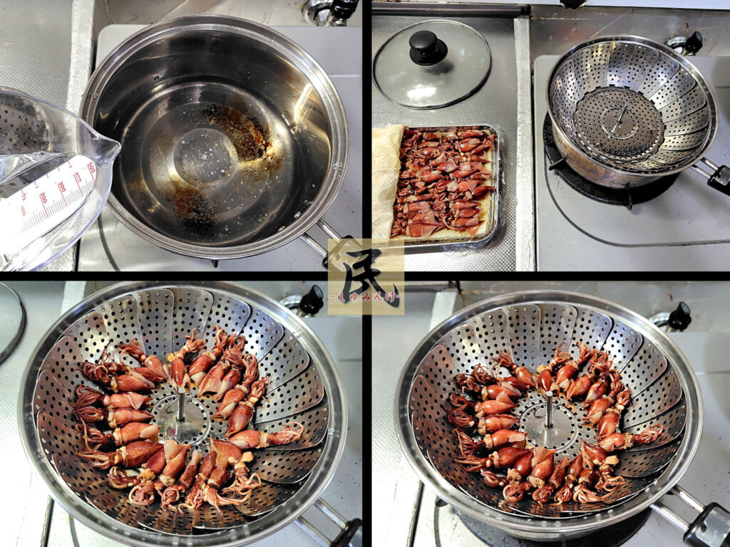 ⑤鍋に水:酒=1:1の割合で入れ、蒸し器をセットし、ホタルイカを並べ、蓋をし中火にかける。
